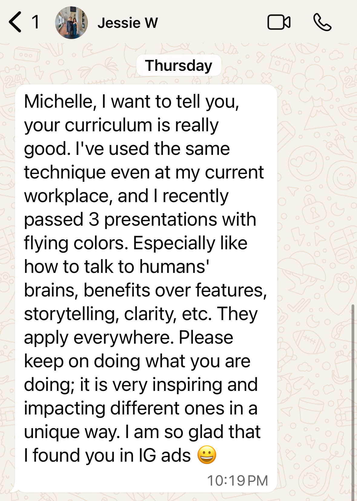 I am familiar enough with Michelle Hon’s reputation to know she is one of the most ethical and honest leaders in the industry. She has been in business for over a decade and been featured on Channel News Asia, Asian Entrepreneur, Asian Money Guide and more. You can see for yourself online. Not to mention, I get so much value every week from her free podcast / blogposts / videos / IG Lives — I can only imagine what I will walk away with after a full training program.I have absolutely no hesitation about the quality, plus there is a 90 days money-back guarantee, so if you are onboard, I would like to go ahead and sign up.